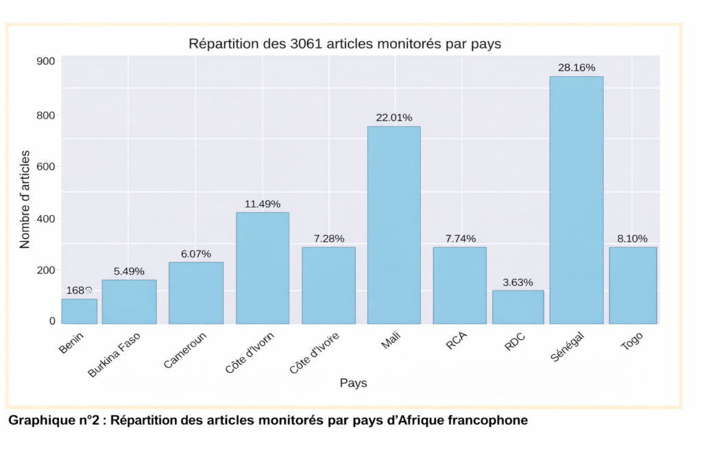 Au terme de cette opération, 3061 articles répartis comme suit et représentant l’ensemble de la production des 26 organisations des 9 pays étudiés ont été monitorés. Le Sénégal (862 articles soit 28,16%) et le Mali (674 articles soit 22,01%) représentent le plus grand volume de l’échantillon. Le Cameroun avec 352 articles (11,49%) tient la troisième place dans l’échantillon, devant le Togo (248 articles soit 8,10%), la République Centrafricaine (237 articles soit 7,74%), la Côte d’Ivoire (223 articles soit 7,28%) et le Burkina Faso (186 articles soit 6,07%) qui oscillent chacun entre 6% et 8% du total. Le Bénin comptabilise 168 articles étudiés. La République Démocratique du Congo avec 111 articles monitorés représente le plus faible volume de l’échantillon. (Note : Congo Check, la première et principale organisation de fact-checking en RDC ne figure pas dans la présente étude. )