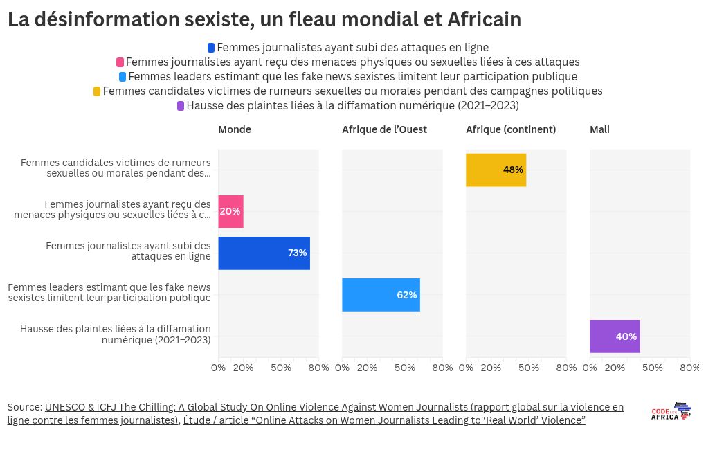 Au Mali, les ONG AMSOPT, AJCAD et WILDAF ont recensé une hausse de 40 % des plaintes liées à la diffamation numérique entre 2021 et 2023, dont une majorité vise des femmes actives dans les médias ou la politique.